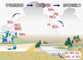 早期的酸雨汙染物大都發生在工廠排放源附近,為了解決當地的空氣汙染,許多工廠將煙囪加高,但排入高空的汙染物卻被大氣環流長距離輸送,造成跨國、跨洲的酸雨問題(如下圖所示)。